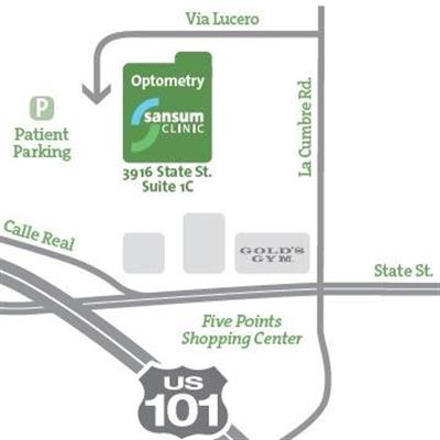 Sansum Clinic’s Optometry Department is located at 3916 State Street in Suite 1-C in Santa Barbara. The easiest way to find our office is to enter from Via Lucero, one block north of State Street at La Cumbre Road.